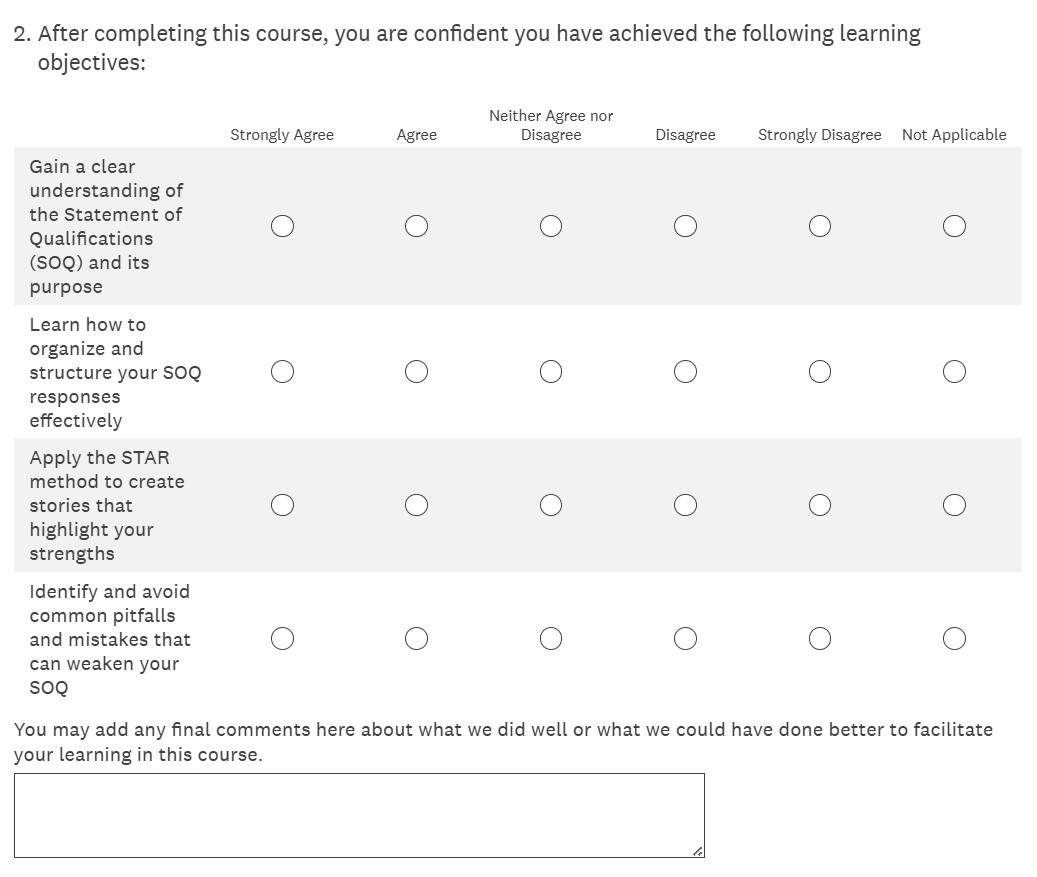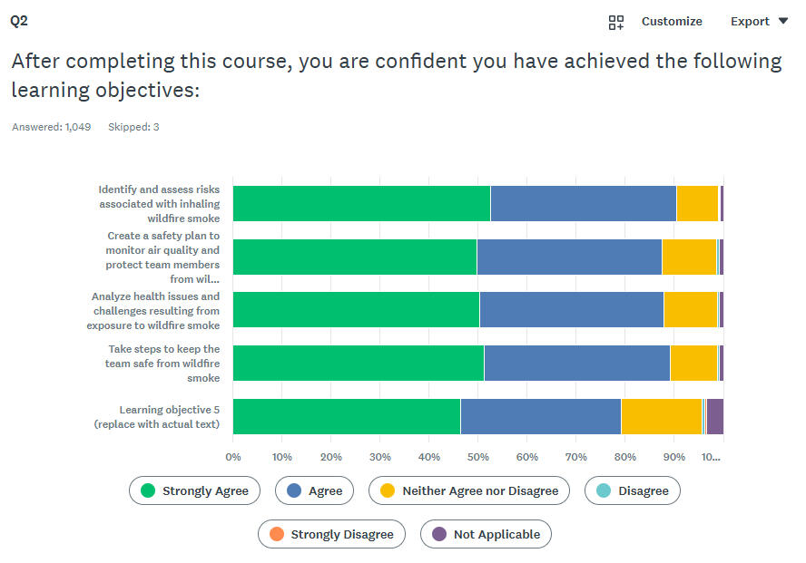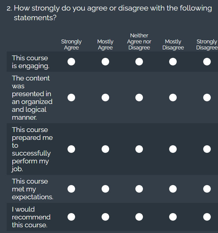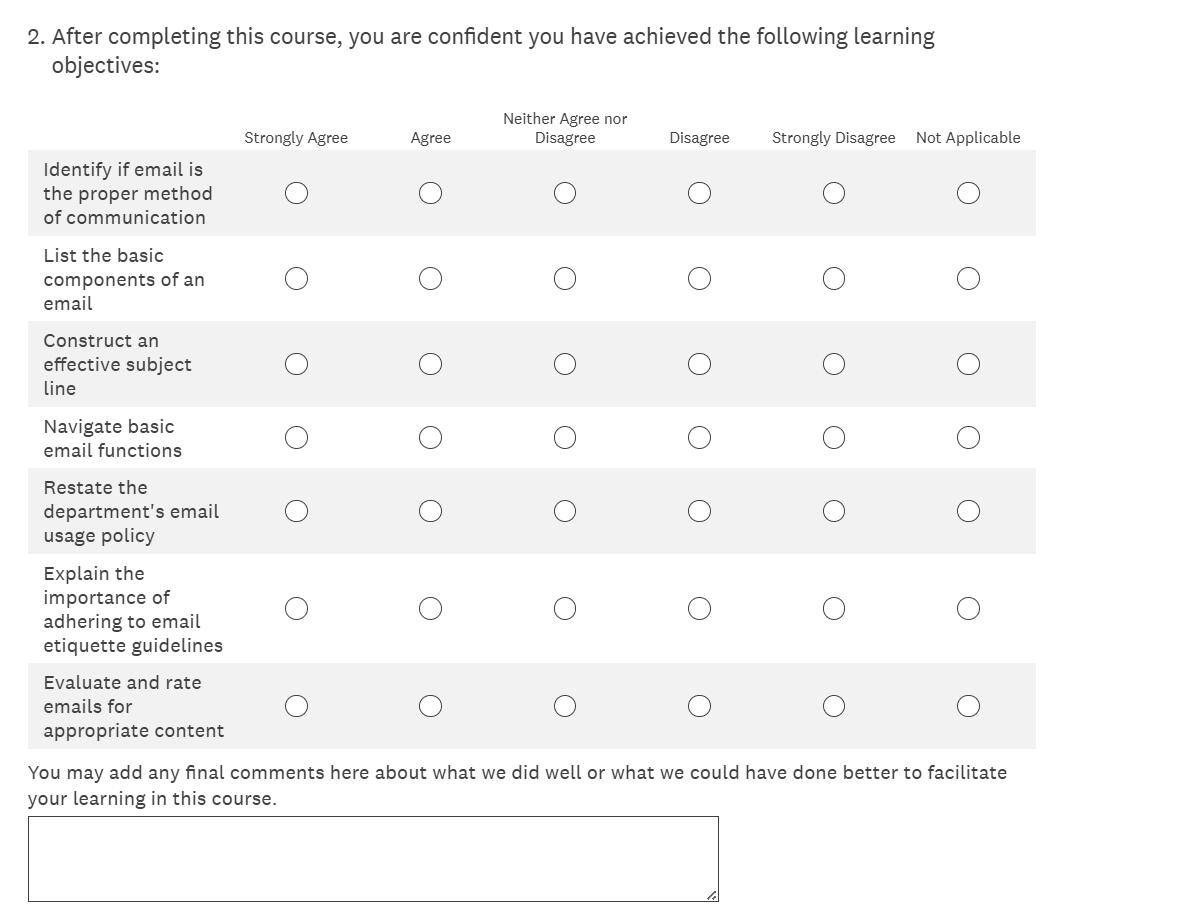 The approach centered on developing a scalable question bank organized around learning objectives rather than course topics. Questions were written using behavior-based language, asking learners what they can do differently after training rather than how they felt about it. This distinction is grounded in evidence-centered design, ensuring that every survey item connects directly to a measurable learning outcome.Standardizing question structure also made data easier to analyze across courses, turning a fragmented feedback process into a repeatable system that teams could use to identify patterns and make informed improvement decisions.