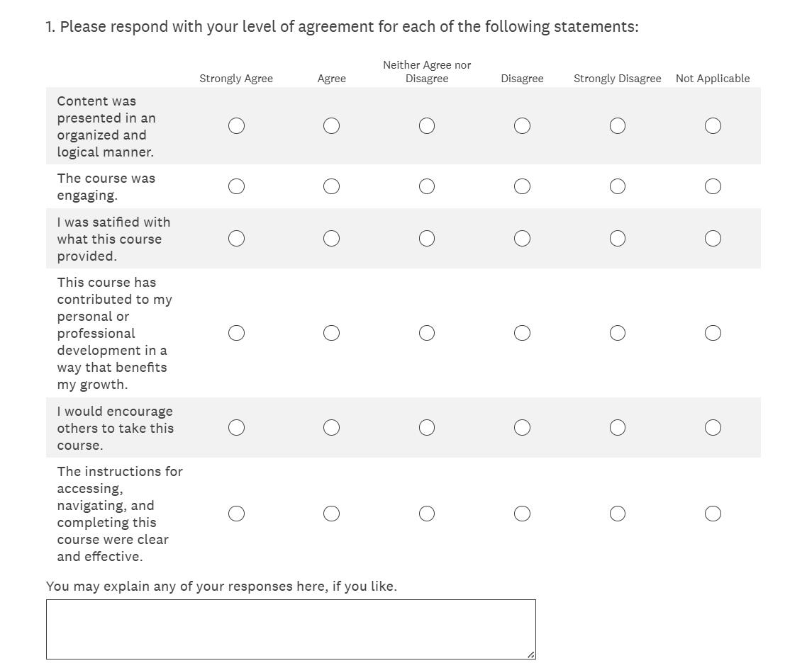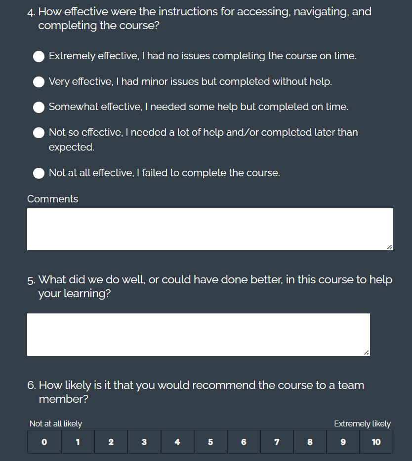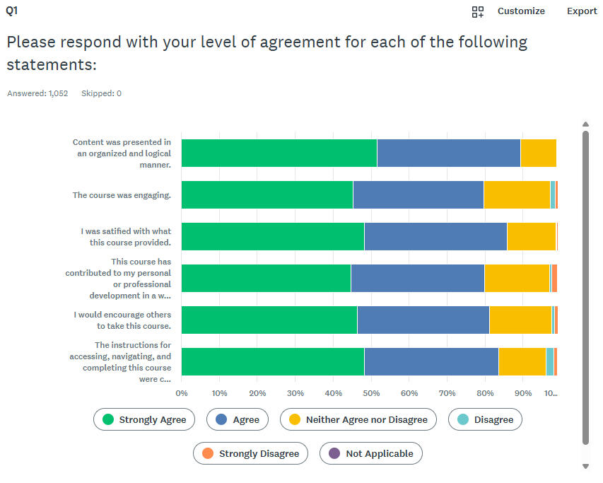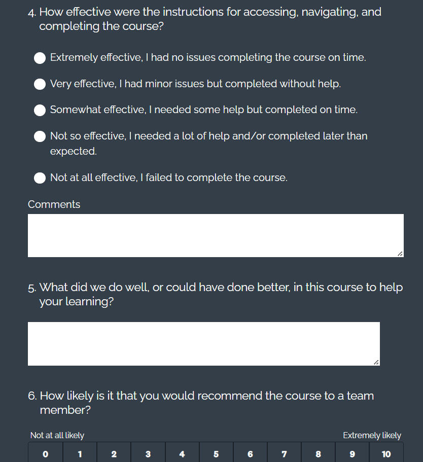 The approach centered on developing a scalable question bank organized around learning objectives rather than course topics. Questions were written using behavior-based language, asking learners what they can do differently after training rather than how they felt about it. This distinction is grounded in evidence-centered design, ensuring that every survey item connects directly to a measurable learning outcome.Standardizing question structure also made data easier to analyze across courses, turning a fragmented feedback process into a repeatable system that teams could use to identify patterns and make informed improvement decisions.