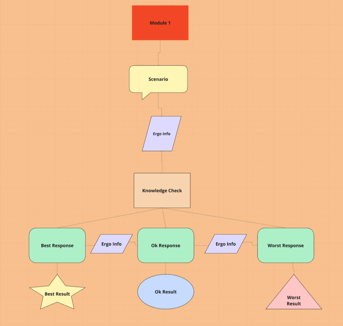 This course was built around scenario-based learning, placing learners in the role of a Single Point of Contact responsible for making real ergonomic decisions. That structure draws on constructivist learning theory, giving learners an active role in building knowledge through realistic problem-solving rather than passive content consumption.Content was organized using backward design, starting with the end goal of confident, independent decision-making, then building the scenario structure and supporting content around that outcome. Modules were kept short and focused to support cognitive load management, reducing overwhelm while keeping learners engaged.Characters and scenarios were grounded in real employee experiences across home and office environments, applying situated learning principles to make the content immediately relevant and transferable.