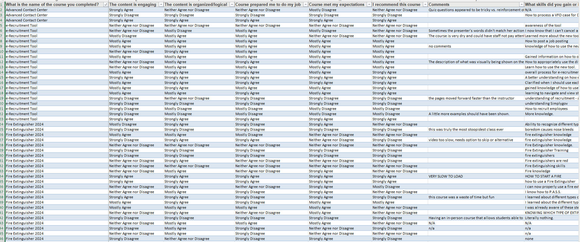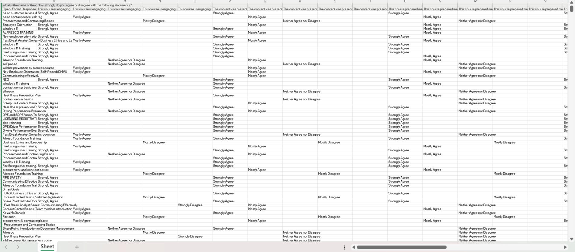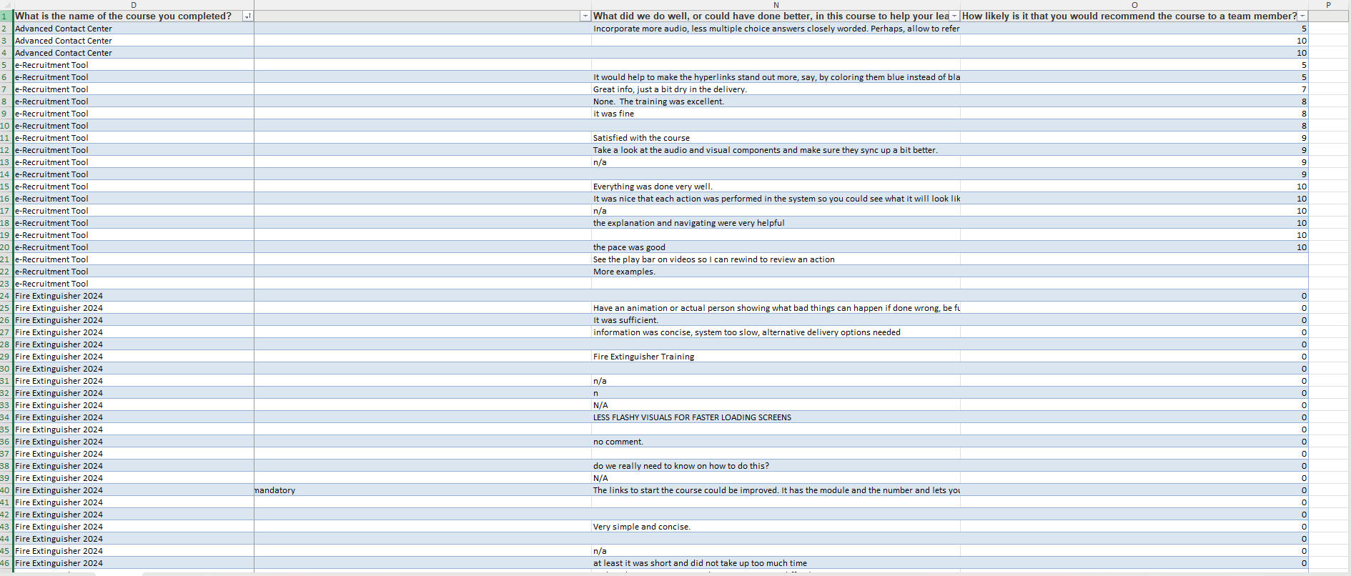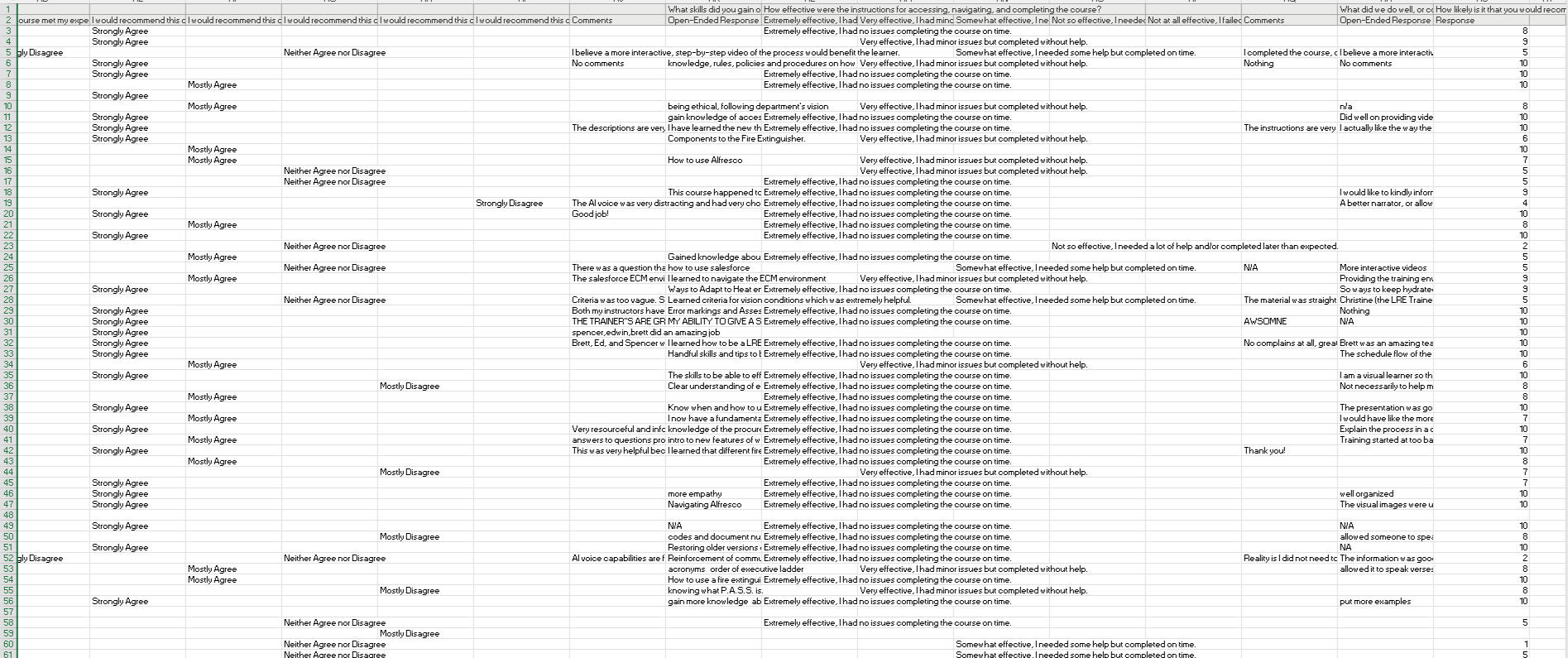 Course evaluations existed but feedback was inconsistent and difficult to analyze across courses. Surveys were often too generic, which limited the ability to understand whether learners actually gained the intended skills or where specific courses needed improvement. The organization needed an evaluation system that could scale, produce comparable data, and drive real course improvement decisions.