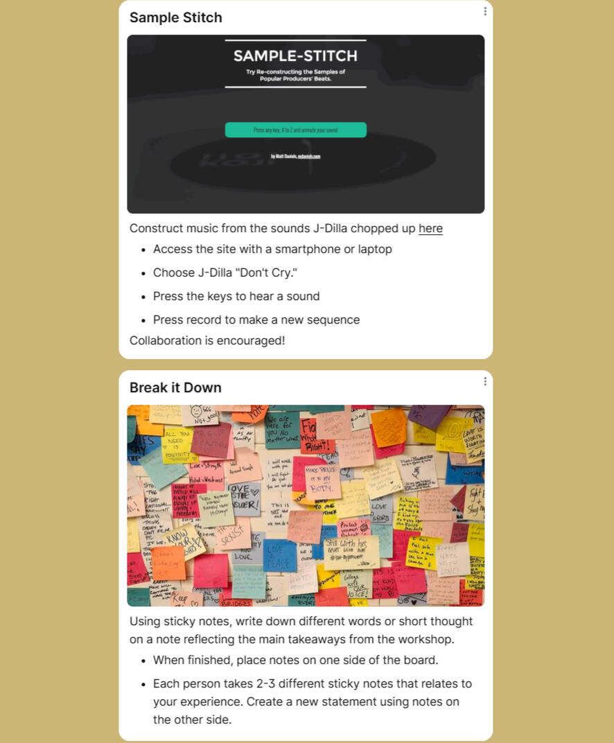 This body of work applies community-centered learning design, building experiences that meet people where they are and use culture as a learning tool rather than a backdrop. Projects draw on media literacy frameworks, participatory learning principles, and facilitation theory to create spaces where people engage actively rather than receive passively.